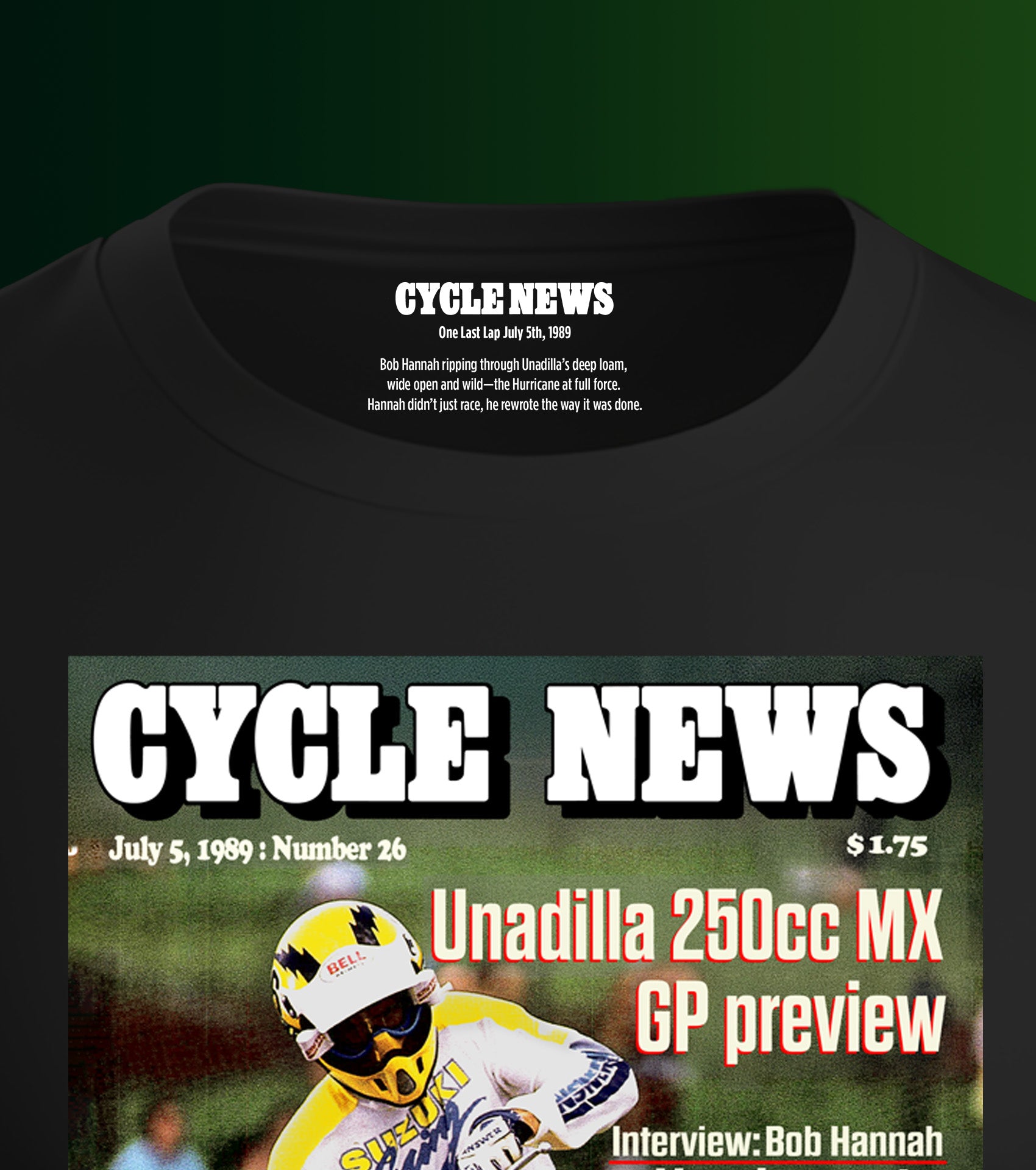 Iconic Cycle News cover shot: Bob “Hurricane” Hannah ripping through Unadilla’s deep loam, wide open and wild. Hannah didn’t just race, he rewrote the way it was done. In 1989, Hannah’s thirteen-year professional MX career was coming to an end with his final race at the 250 MX GP at his favorite track, Unadilla. The Hurricane was interviewed by Cycle News associate editor Kit Palmer as he approached the final race of his legendary career.