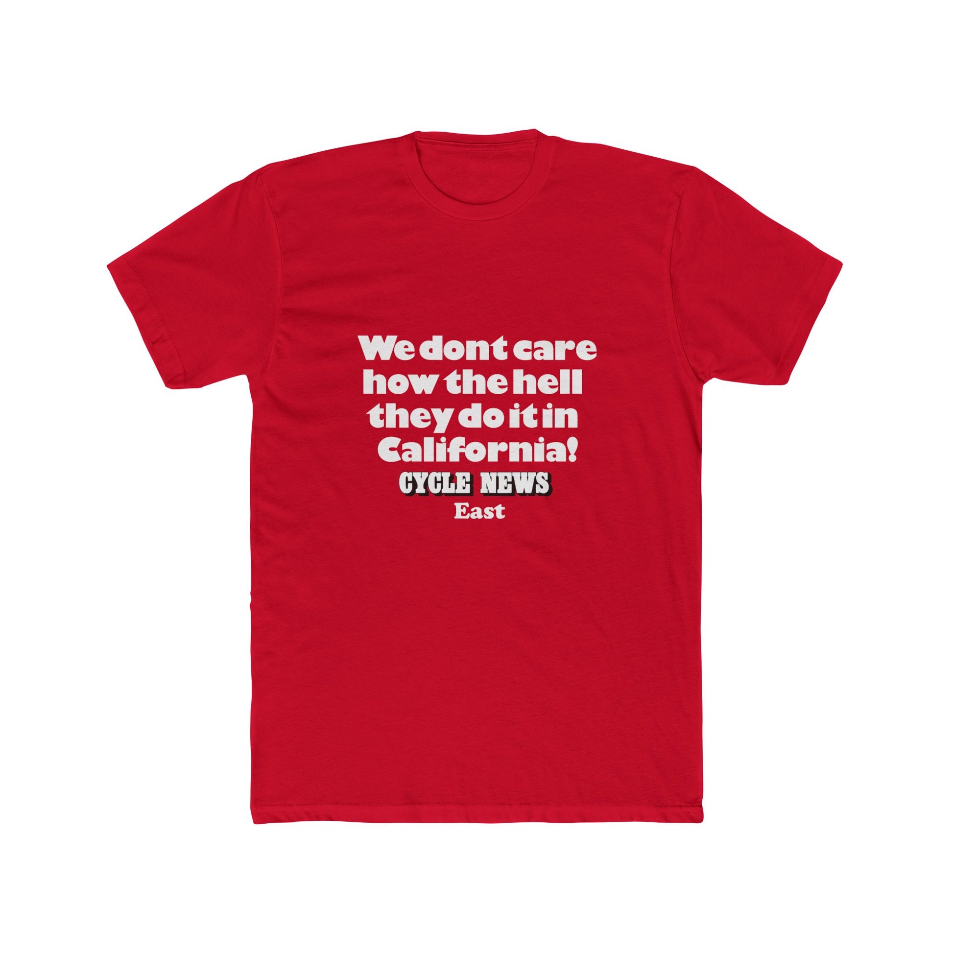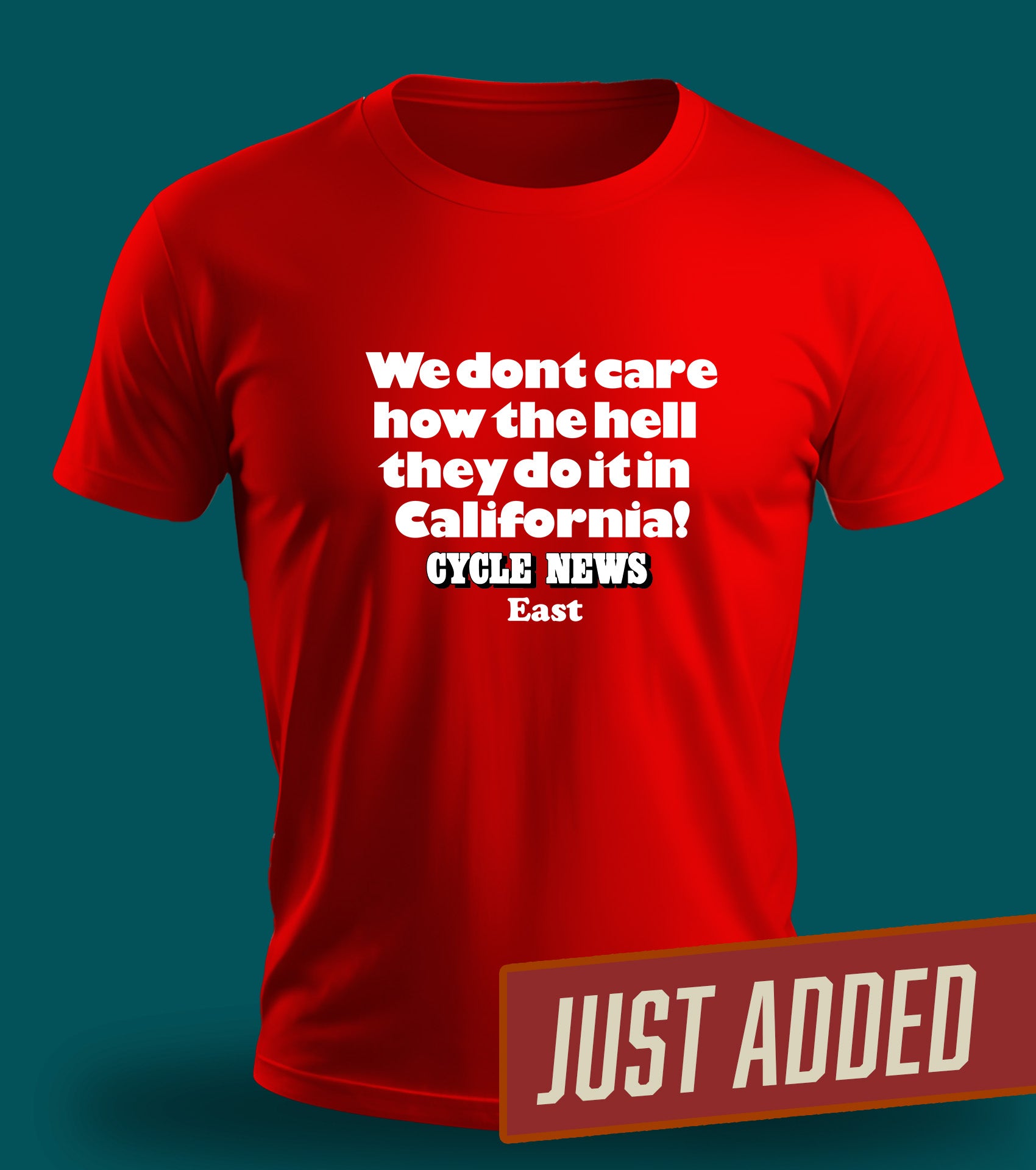 Back when Cycle News split its coverage across regions, local pride ran hotter than a two-stroke on race day. This retro tee throws it back to that gritty era with the defiant rally cry: “We don’t care how the hell they do it in California.”